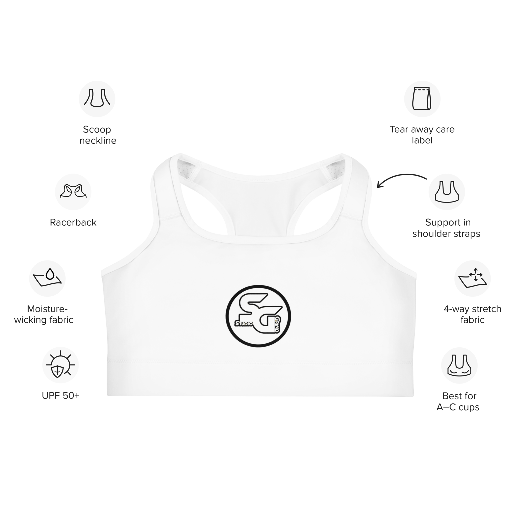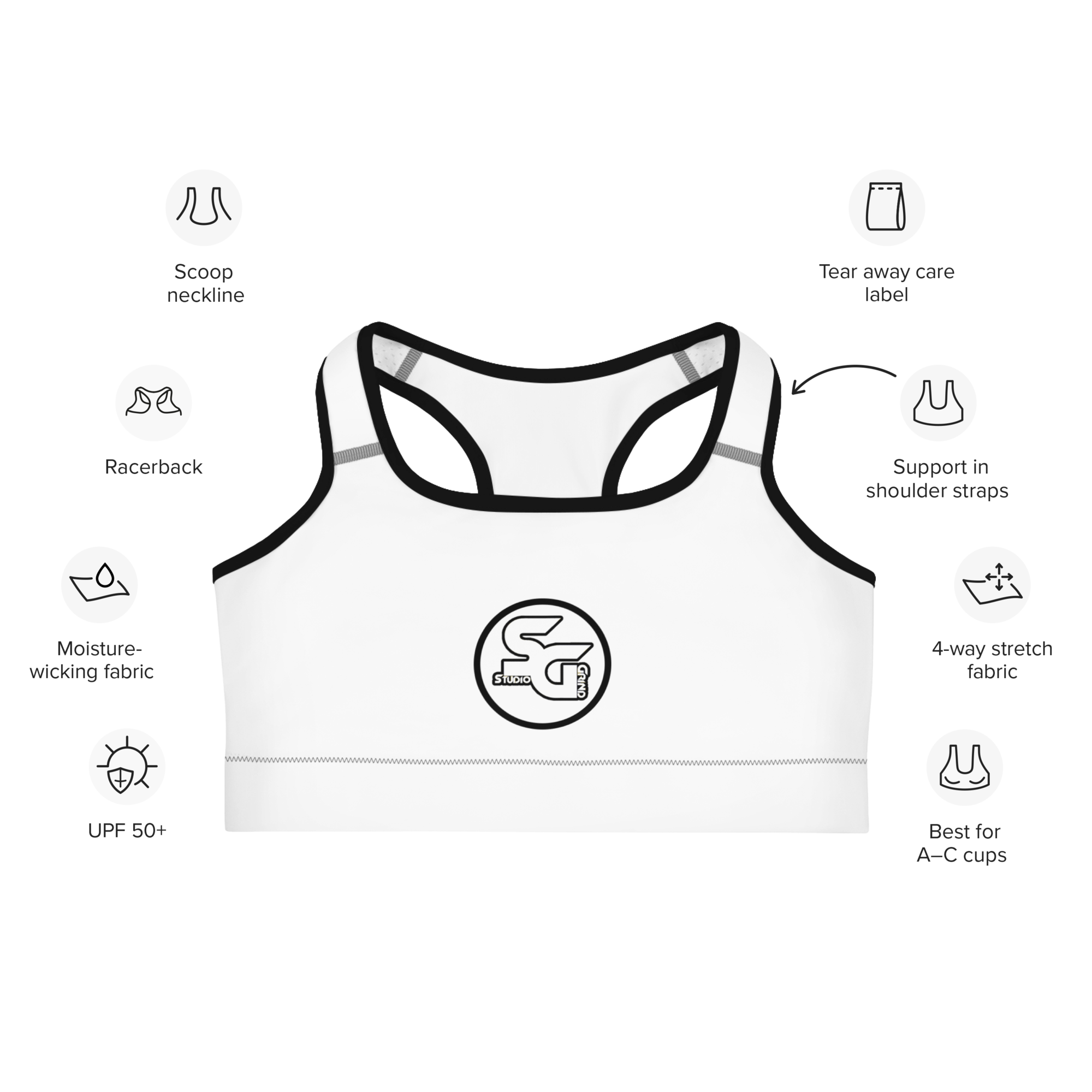 • Support material in the shoulder straps, double-layered front, and a wide elastic band under breasts for extra support
